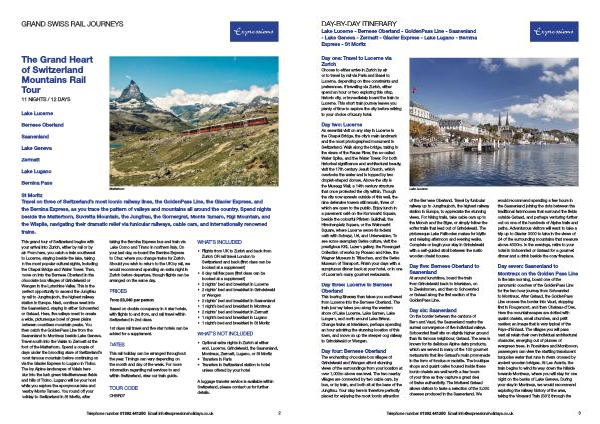 This grand tour of Switzerland begins with your arrival into Zurich , either by rail or by air . From here , you catch a train southwest to Lucerne , staying beside the lake , taking in the most popular cultural sights , including the Chapel Bridge and Water Tower . Then , move on into the Bernese Oberland in the chocolate box villages of Grindelwald or Wengen in the Lutschine Valley . This is the perfect opportunity to ascend the Jungfrau by rail to Jungfraujoch , the highest railway station in Europe . Next , continue west into the Saanenland , staying in either Schoenried or Gstaad . Here , five valleys meet to create a wide , picturesque bowl of green plains between countless mountain peaks . You then catch the GoldenPass Line from the Saanenland to Montreux beside Lake Geneva . Travel south into the Valais to Zermatt at the foot of the Matterhorn . Spend a couple of days under the brooding stare of Switzerland ’ s most famous mountain before continuing on via the Glacier Express to Lugano in Ticino . The icy Alpine landscapes of Valais here blur into the lush green Mediterranean fields and hills of Ticino . Lugano will be your host while you explore the eponymous lake and nearby Monte Tamaro . You round off your holiday to Switzerland in St Moritz , after taking the Bernina Express bus and train via Lake Como and Tirano in northern Italy . On your last day , re-board the Bernina Express to Chur , where you change trains for Zurich . Should you wish to return to the UK by rail , we would recommend spending an extra night in Zurich before departure , though flights can be arranged on the same day .